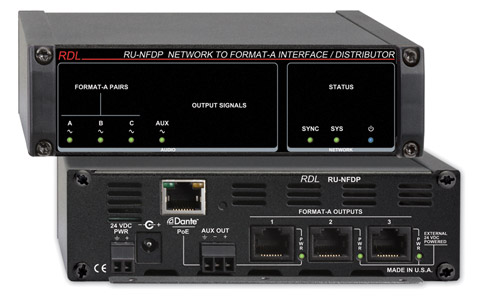 RDL RU-NFDP INTERFACE DANTE sortie, 3x format-A RJ45 out, aux term block out, POE