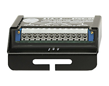 Amplificateur à une sortie pour alimenter de petits haut-parleurs (4 - 45ohms), un circuit d’ordre ou des systèmes de conférence. Cinq contrôleurs d’entrées (par lise à la masse et compatibles avec les circuits à collecteur ouvert) contrôlés, par exemple, par cinq modules ST-GSP1, contrôlent l’atténuation. Une entrée coupe la sortie pour éviter tout accrochage avec un micro exposé. Deux entrées pour une gestion par deux positions adjacentes font chuter le niveau de sortie de 6dB afin d’éviter tout Larsen ou toute coloration du signal. Deux entrées supplémentaires se connectent à deux positions situées plus loin pour réduire le niveau de 3dB. Entrée : -10dBV minimum pour 2 Watts en sortie, avec une utilisation symétrique ou asymétrique, pontage 20k Ohms. Puissance en sortie : 1,75W continus, 2W max. Bruit : <-80dB réf. 2W en sortie. Bande passante : 45Hz à 14kHz. Distorsion harmonique totale : <0.5%. CMRR : >60dB à 100Hz. Atténuation : -Mute >90dB à 1kHz, deux entrées indépendantes par chacune des deux fonctions d’atténuation de -3dB et -6DB respectivement. Alimentation : simple, référencé masse, 220mA.