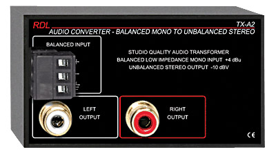 RDL TX-A2 CONVERTISSEUR AUDIO sym.vers asymétrique, mono vers stéréo, entrée sur borne, 2x sortie RCA