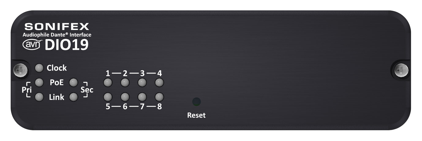 La DIO08 dispose des mêmes fonctionnalités que l'AVN-DIO06, mais la connectivité entrée/sortie AES3 est assurée par un bornier à 6 pts et non par des connexions XLR. La connexion Dante se fait au moyen d'un connecteur Neutrik EtherCon, qui permet également le PoE (alimentation par Ethernet). L'entrée/sortie AES3 est symétrique. Compatibilité avec les fréquences d'échantillonnage AES3 : 32 kHz, 44,1 kHz, 48 kHz, 88,2 kHz, 96 kHz, 176,4 kHz et 192 kHz, et avec les fréquences d'échantillonnage Dante : 44,1 kHz, 48 kHz, 88,2 kHz et 96 kHz, avec codage PCM16/24/32.