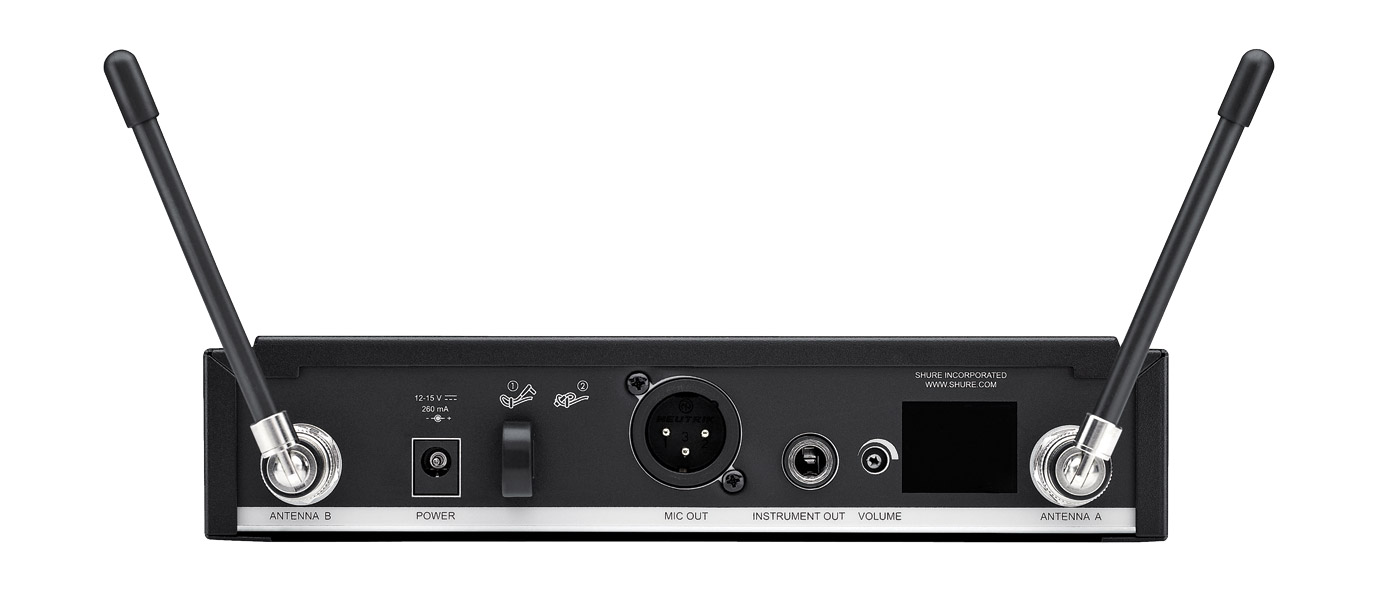 Le récepteur sans fil Shure BLX4 est logé dans un boîtier en ABS moulé et a le rapport coût-efficacité le plus avantageux, tout en offrant les mêmes fonctionnalités de balayages de canaux et de groupes avec antenne interne pour un transport plus facile. L'avant présente le mouton marche/arrêt, les touches de balayage de canaux et de groupes ainsi qu'un affichage LED à deux chiffres affichant le canal choisi. Une LED s'allume en vert lorsque l'émetteur est relié à la fréquence d'un émetteur et peut être utilisé. Une deuxième LED bicolore s'allume en vert indiquant que le niveau audio est normal et en rouge indiquant la crête ou la surcharge. L'arrière dispose de l'entrée secteur CC 12-15V, 160mA, trois sorties XLR symétriques et une sortie jack 6,35mm de niveau ligne.