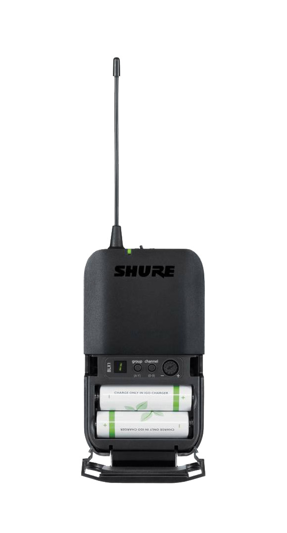 Le BLX1 a les mêmes fonctionnalités que l'émetteur à main BLX2 mais il est conçu pour fonctionner avec les microphones serre-tête SM31FH ou SM35, le micro MX153 ou le micro-cravate CVL. Toutes les touches de fonction se trouvent dans le compartiment à piles. Il fonctionne également sur deux piles AA alcalines offrant jusqu'à 14h d'autonomie. La partie supérieure du boîtier est doté d'une antenne fouet captive ainsi que d'une entrée microphone TA4 4 points.