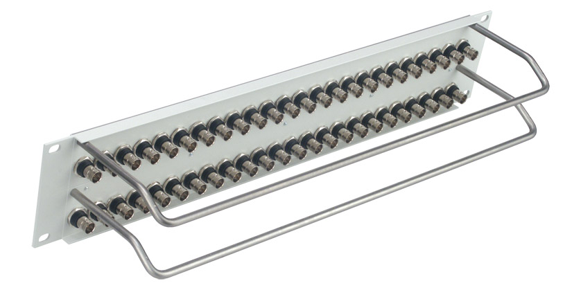 Fabriqués en profilé d’aluminium, la face avant du panneau est inclinée vers le bas de 7,5° à partir de la verticale afin d’éliminer les tensions sur les cordons et assurer un libre accès à l’arrière. Les panneaux sont entièrement équipés d’embases Coax Connectors ‘KORUS’ dos-à-dos, ‘Ultra HD’, 12G, 75 ohms, équidistantes sur toute la longueur du panneau. L’arrière est doté de deux barres attache-câbles courtes et recourbées pour chaque rang. Un porte légende en plastique à pression, est installé au-dessus de chaque rang, permettant l’insertion d’une bande de 7,5mm.