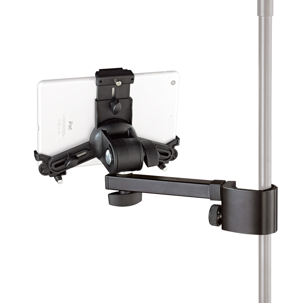 Ce modèle permet d'accueillir une variété de tablettes de différentes hauteurs, largeurs et profondeurs. Le support est compatible avec les appareils de 5 à 11 mm de profondeur ; 163mm à 242 mm de hauteur ; 102 à 189 mm de largeur, ce qui le rend compatible avec des appareils tels que l'iPad d'Apple, l'iPad 9.7, l'iPad Pro, l'Amazon Fire HDX 8.9, la Google Nexus 9 et d'autres appareils de dimensions similaires. Lors de la première utilisation, il peut être ajusté à la taille de l'appareil avant que les vis de serrage ne figent les positions. Un loquet permet une installation et une libération rapide de la tablette. Un écrou papillon situé à l'arrière du support permet de régler l'angle d'affichage de la tablette ; il est également possible de régler les positions portrait ou paysage. Un filetage standard 3/8" permet une fixation aux pieds de micro et aux accessoires. Poids : 0,36 kg.