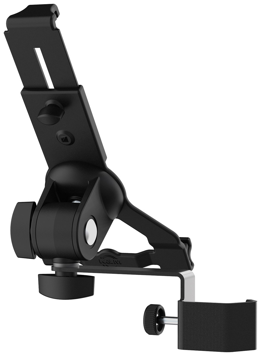 Ce modèle permet d'accueillir une variété de tablettes de différentes hauteurs, largeurs et profondeurs. Le support est compatible avec les appareils de 5 à 11 mm de profondeur ; 163mm à 242 mm de hauteur ; 102 à 189 mm de largeur, ce qui le rend compatible avec des appareils tels que l'iPad d'Apple, l'iPad 9.7, l'iPad Pro, l'Amazon Fire HDX 8.9, la Google Nexus 9 et d'autres appareils de dimensions similaires. Lors de la première utilisation, il peut être ajusté à la taille de l'appareil avant que les vis de serrage ne figent les positions. Un loquet permet une installation et une libération rapide de la tablette. Un écrou papillon situé à l'arrière du support permet de régler l'angle d'affichage de la tablette ; il est également possible de régler les positions portrait ou paysage. Un filetage standard 3/8" permet une fixation aux pieds de micro et aux accessoires. Poids : 0,36 kg.