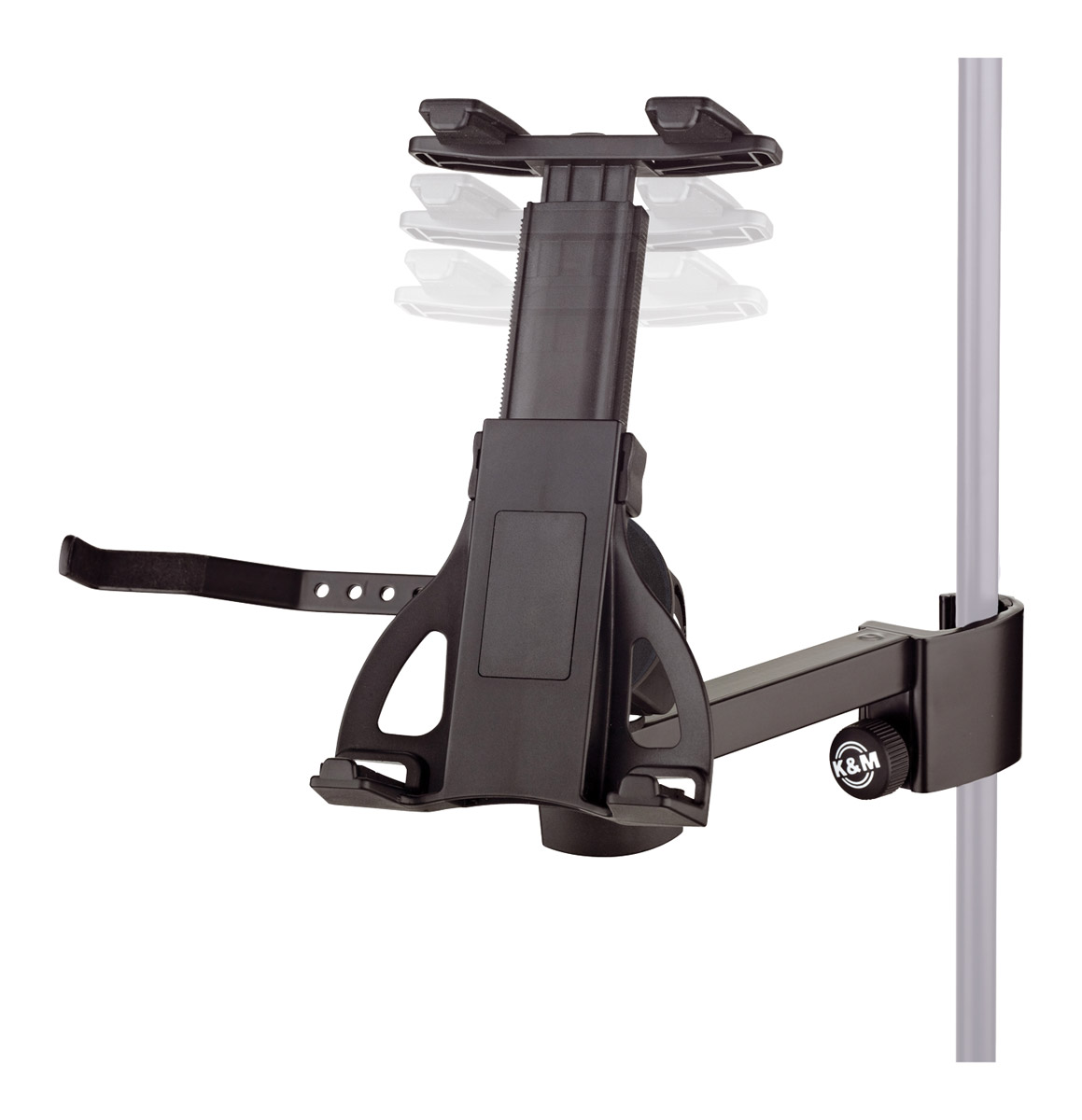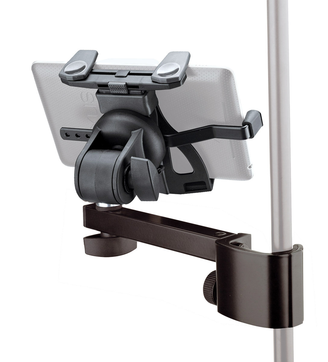 Ce modèle permet d'accueillir une variété de tablettes de différentes hauteurs, largeurs et profondeurs. Le support est compatible avec les appareils de 5 à 11 mm de profondeur ; 163mm à 242 mm de hauteur ; 102 à 189 mm de largeur, ce qui le rend compatible avec des appareils tels que l'iPad d'Apple, l'iPad 9.7, l'iPad Pro, l'Amazon Fire HDX 8.9, la Google Nexus 9 et d'autres appareils de dimensions similaires. Lors de la première utilisation, il peut être ajusté à la taille de l'appareil avant que les vis de serrage ne figent les positions. Un loquet permet une installation et une libération rapide de la tablette. Un écrou papillon situé à l'arrière du support permet de régler l'angle d'affichage de la tablette ; il est également possible de régler les positions portrait ou paysage. Un filetage standard 3/8" permet une fixation aux pieds de micro et aux accessoires. Poids : 0,36 kg.
