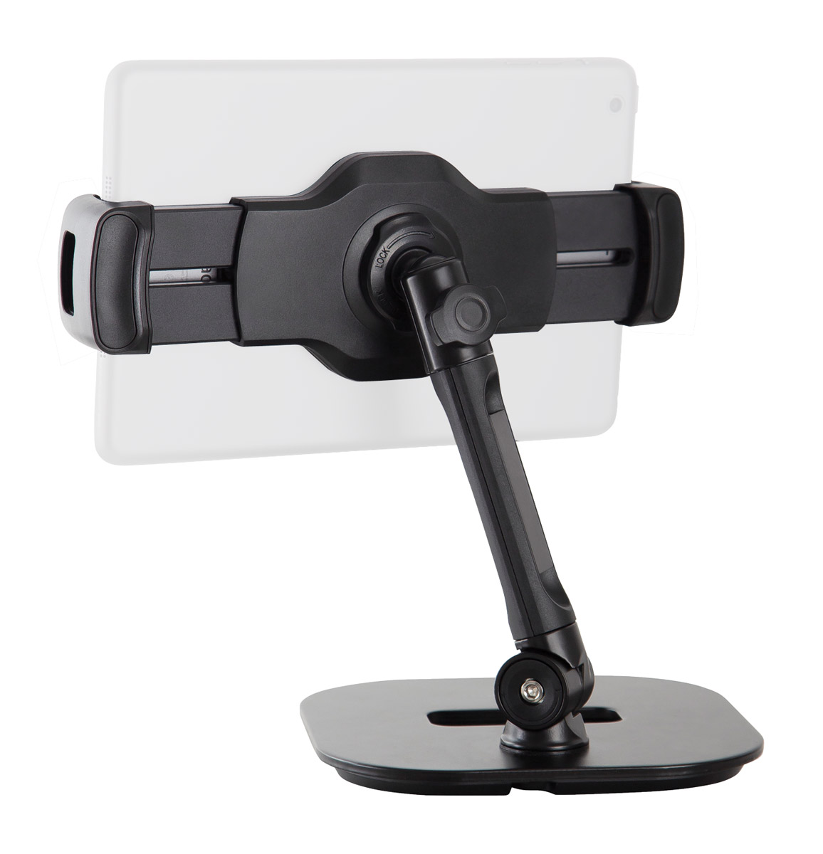 Ce modèle permet d'accueillir une variété de tablettes de différentes hauteurs, largeurs et profondeurs. Le support est compatible avec les appareils de 5 à 11 mm de profondeur ; 163mm à 242 mm de hauteur ; 102 à 189 mm de largeur, ce qui le rend compatible avec des appareils tels que l'iPad d'Apple, l'iPad 9.7, l'iPad Pro, l'Amazon Fire HDX 8.9, la Google Nexus 9 et d'autres appareils de dimensions similaires. Lors de la première utilisation, il peut être ajusté à la taille de l'appareil avant que les vis de serrage ne figent les positions. Un loquet permet une installation et une libération rapide de la tablette. Un écrou papillon situé à l'arrière du support permet de régler l'angle d'affichage de la tablette ; il est également possible de régler les positions portrait ou paysage. Un filetage standard 3/8" permet une fixation aux pieds de micro et aux accessoires. Poids : 0,36 kg.