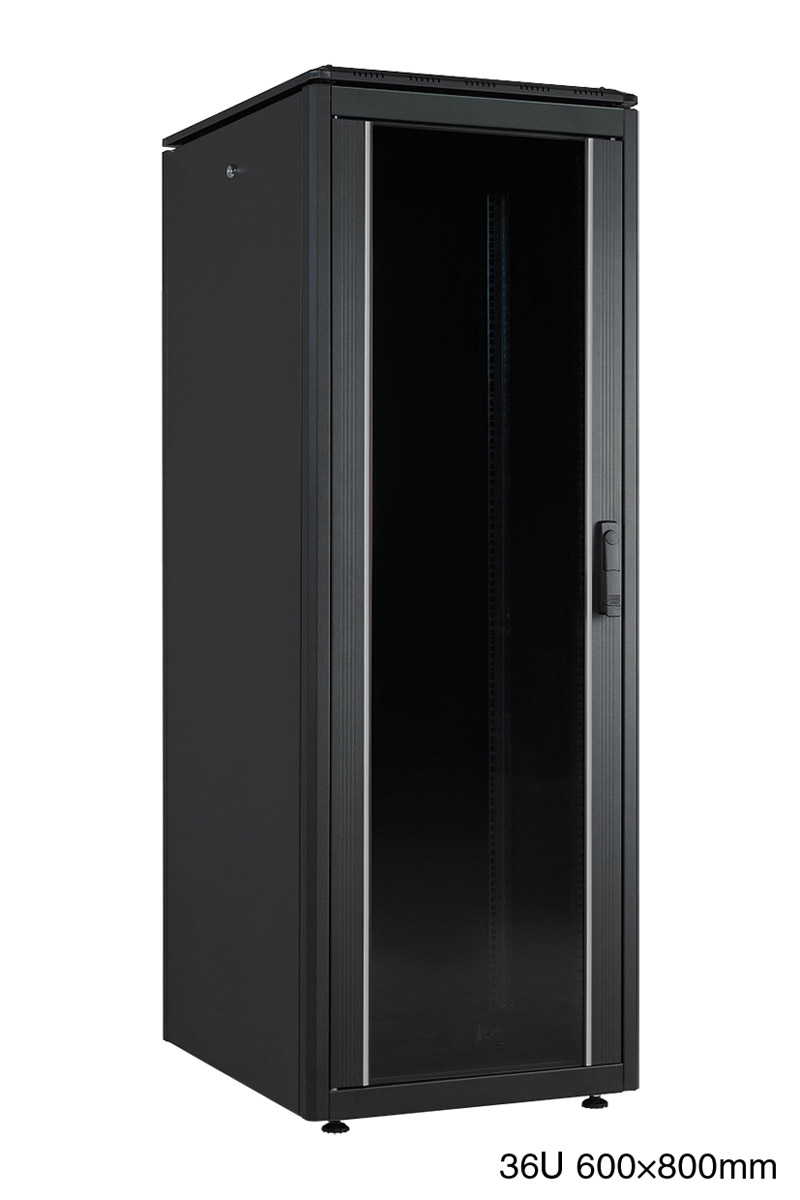 Disponibles en profondeurs de 600mm, 800mm et 1000mm. Chaque rack possède quatre piliers formant le châssis du rack, fixés à un cadre en haut et en bas. Des traverses horizontales se fixent sur les piliers, dans la direction avant-arrière. Des profilés de montage (cornières de rack) se fixent à l'avant et à l'arrière des traverses et sont réglables sur la profondeur de l'armoire pour permettre l'installation de rails coulissants de rack et d'équipements plus ou moins profonds. Les cornières de montage ont deux jeux de perforations pour recevoir les écrous cages, afin de fixer les équipements sur les faces libres du rack et les accessoires, comme les étagères et les supports de châssis, à l'intérieur du rack. Il y a trois orifices à écrou cage pour 1U sur chaque face et une sérigraphie marque les unités de hauteur en "U" pour faciliter l'installation.