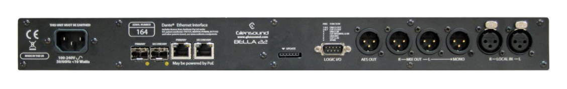 Le panneau arrière du Bella 22 mkII présente, de gauche à droite, une prise secteur standard ICE qui accepte des tensions alternatives externes de 100-240 VAC+/- 10% avec fusible interne. Sa consommation maximale de courant est de 10W. Deux ports Ethernet RJ45 en cuivre, peuvent accepter des câbles réseau standard. Un seul port doit être connecté à votre réseau pour transmettre correctement l'audio du réseau Dante/AES67, cependant les deux ports, primaire et secondaire, peuvent être utilisés si une topologie de réseau redondante est utilisée. Les deux ports sont de type gigabit Ethernet et les LED clignotent pour indiquer que les données sont correctement communiquées avec un commutateur. Une prise de mise à jour est disponible mais ne doit être utilisée que par un ingénieur agréé de Glensound dans le cas peu probable où le nouveau code interne du microprocesseur doit être réinstallé dans le Bella 22. Le microprocesseur interne est un PIC. Une fiche Sub-D à 9 broches donne accès aux circuits GPIO (entrées et sorties à usage général). Ces circuits sont utiles pour la connexion à des dispositifs externes tels que les témoins rouges On Air.