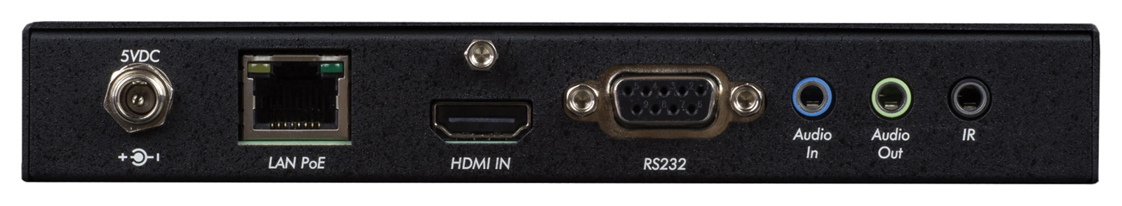 Sur le panneau arrière, une entrée d'alimentation 5V DC est positionnée à côté d'une sortie HDMI (entrée sur l'émetteur), d'une connexion RS232, d'un connecteur jack femelle 3,5mm pour 'Sensor IR' ('Emitter IR' sur l'émetteur), d'une prise jack femelle 3,5mm pour la sortie audio (audio in sur l'émetteur) et RJ45 pour la connexion LAN et l'alimentation POE.