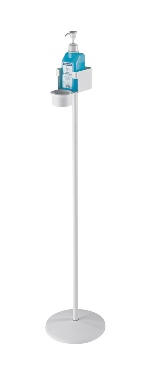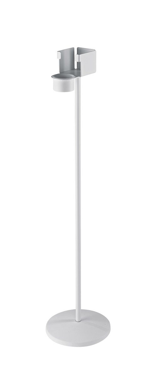 Ce support pour distributeur de désinfectant sur pied repose sur une base ronde dotée d'un anneau en caoutchouc antidérapant. La partie supérieure, fixée à une tige tubulaire en acier fixée à la base, retient le contenant du désinfectant et dispose d'un bac de récupération amovible. Finition peinture poudre blanche.