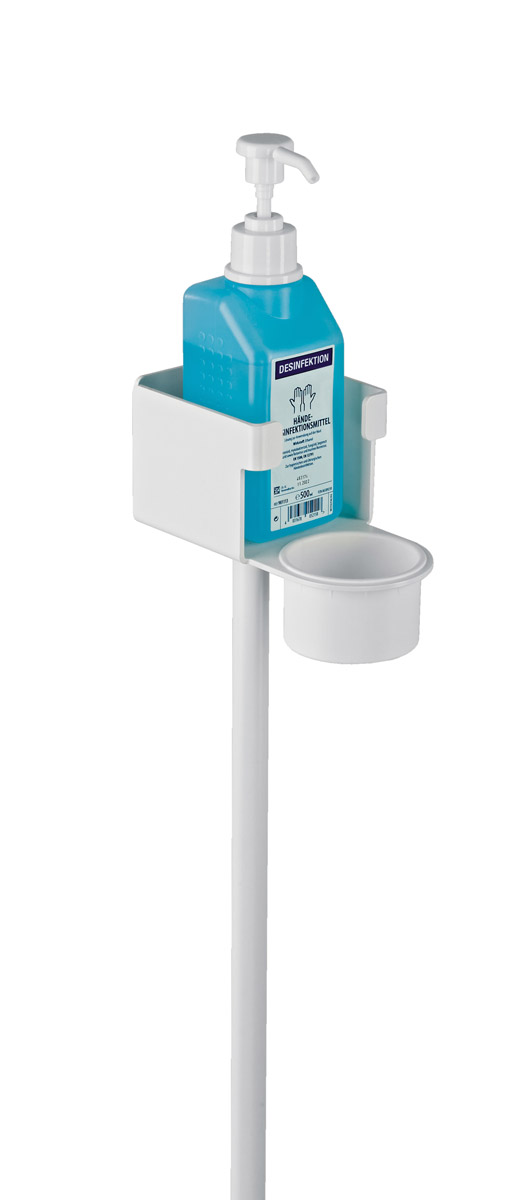 Ce support permet d'accueillir une bouteille de gel désinfectant pour les mains d'une dimension maximale de 102 x 91mm. Un gobelet en plastique de récupération amovible permet d'éviter que le liquide tombe au sol. Couleur blanche.