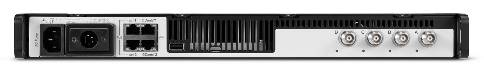 Le récepteur ULXD4D dispose de toutes les fonctionnalités et caractéristiques du récepteur ULXD4, mais il est doublé en termes de canaux et est alimenté en ca 100-240V via l'entrée d'alimentation IEC. L'ULXD4D dispose également de connexions réseau primaires et secondaires.