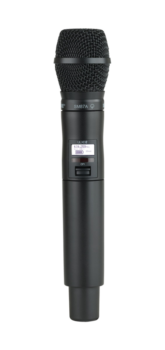 L'émetteur portatif ULXD2 est fabriqué en métal pour plus de durabilité et propose des capsules micro interchangeables, notamment SM58, BETA58a, KSM8, BETA87a entre autres. Cet émetteur portatif est capable d'émettre une plage de fréquences de 20 Hz à 20 kHz avec une réponse plate, néanmoins chaque capsule micro offre une courbe de réponse en fréquences différente. L'utilisation peut durer jusqu'à neuf heures en continu ; un seul bloc de piles au lithium SB900-B, ou des piles alcalines AA peuvent être utilisées comme alternative. Des contacts de charge externes à la base du microphone permettent de recharger les piles SB900-B sur place lorsqu'elles sont utilisées avec l'unité de charge Shure SBC200-UK ou SBC800-UK compatible. Comme l'ULXD1, l'ULXD2 offre un écran LCD qui affiche les informations importantes, notamment le groupe/canal et la fréquence. Les fonctions de verrouillage sont accessibles en naviguant dans le menu utilisateur.