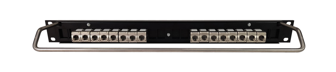 Fabriqués à partir d'un profilé d'aluminium léger mais extrêmement rigide. Les connecteurs montés dans un sous châssis et sont affleurants en façade. Ces panneaux sont dotés d'un fixe-câbles coudé pour un accès facile aux prises arrière. Les connecteurs sont arrangés en groupes équivalents de part et d'autre d'une division centrale et un porte-légende avec protège-bande à pression est monté au-dessus de chaque rangée de connecteurs afin de permettre d'insérer les bandes de papier fournies avant ou après l'installation; 7,5 mm de hauteur imprimable.