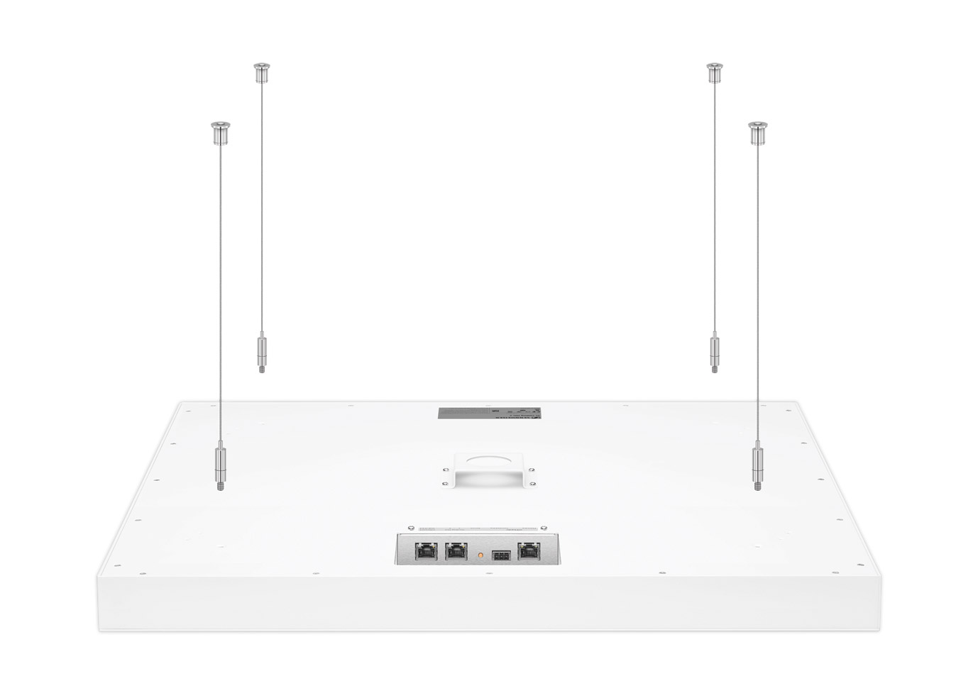 Le kit permet à l'installateur de suspendre le plafond TeamConnect 2 jusqu'à 5 m du plafond. Le kit comprend : 4 fils d'installation au plafond, 4 câbles en acier de 5 m, 4 fils de fixation au plafond.