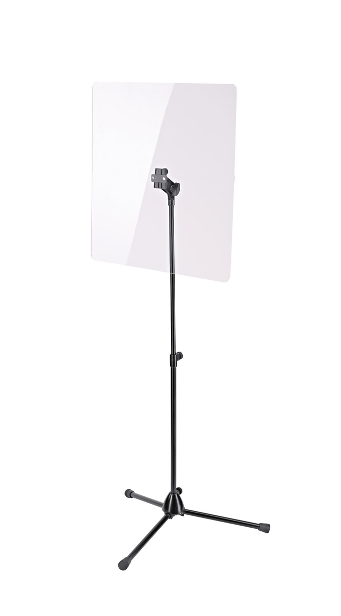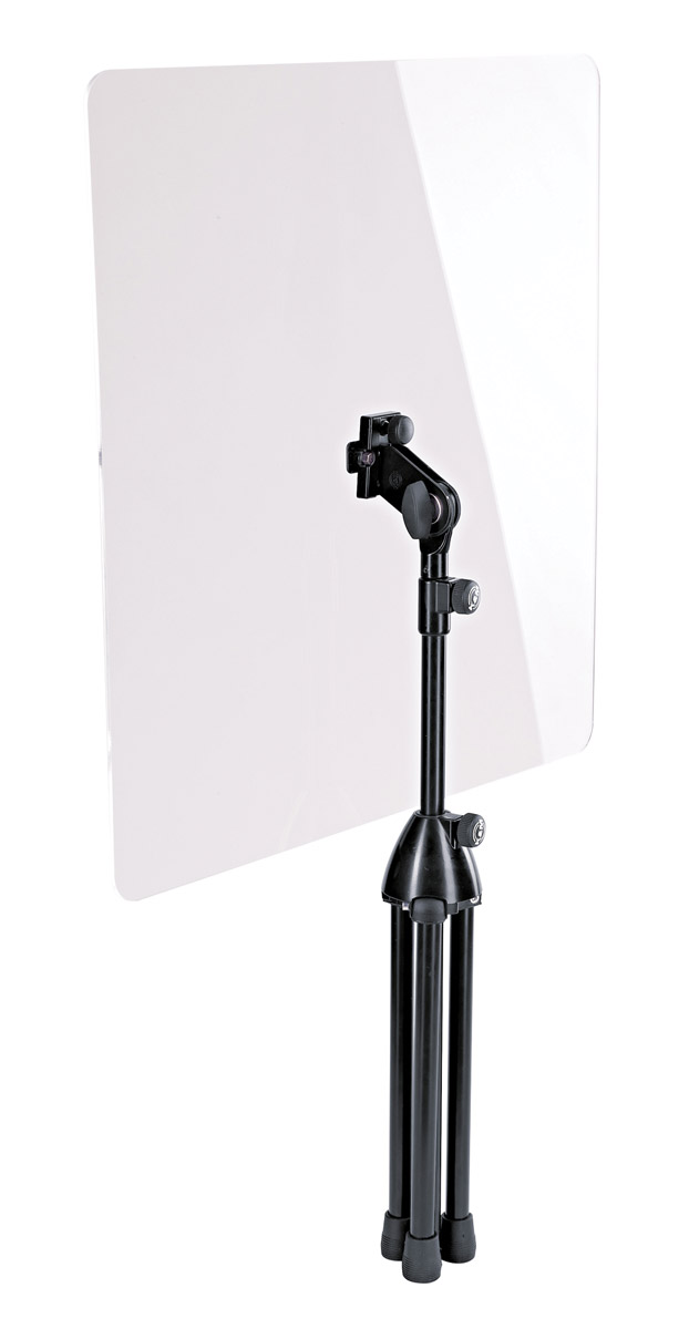 Un écran concave fabriqué en verre acrylique et mesurant 450 x 240mm. L'écran d'isolation acoustique est fixé au support de trépied inclus par le biais du connecteur en V de K&M pour une insertion et une libération rapides. Le trépied en acier est réglable en hauteur de 900 à 1400 mm et a un diamètre de 670mm.