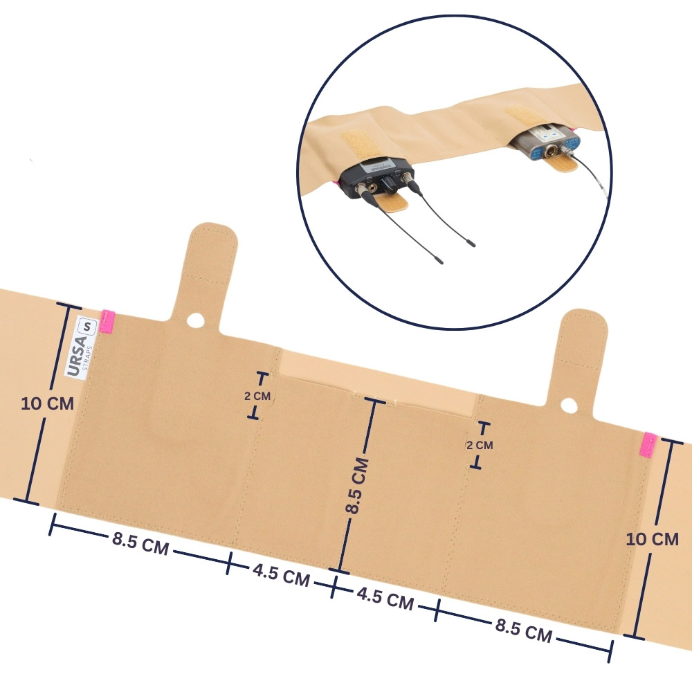 La principale différence entre la Live Strap et les autres ceintures URSA est la facilité d'accès au matériel sans fil qu'elle contient. La pochette intégrée mesure 9,5 cm de haut sur 8 cm de large et n'enserre donc pas le matériel comme le font les autres pochettes. Une fermeture à scratch assure la sécurité.
