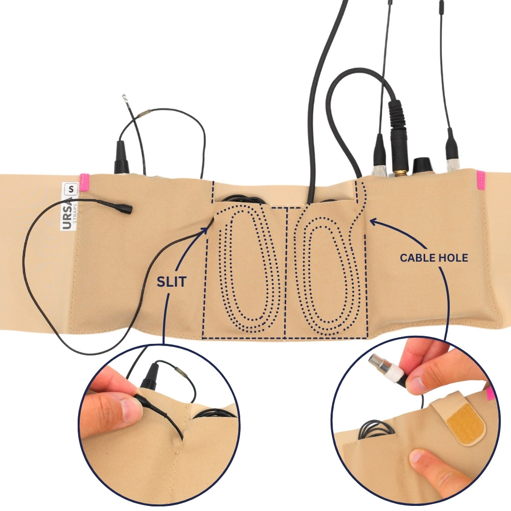 Ces ceintures "ultra-minces et respirantes" sont fabriquées à partir d'un tissu collé de 1 mm d'épaisseur qui permet de fixer la pince à crochet à n'importe quel endroit. Ainsi, l'utilisateur peut toujours positionner et attacher la ceinture à un niveau qui lui est confortable. Disponibles avec de petites ou grandes poches intégrées mesurant respectivement 8,9 x 7,8 cm ou 10 x 8 cm, les packs d'émetteurs sans fil de marques telles que Shure, Sennheiser et Sony sont compatibles (voir tableau ci-dessous). En plus de la poche qui contient l'émetteur ou le récepteur, une deuxième poche à extrémité ouverte permet de ranger le surplus de câble.