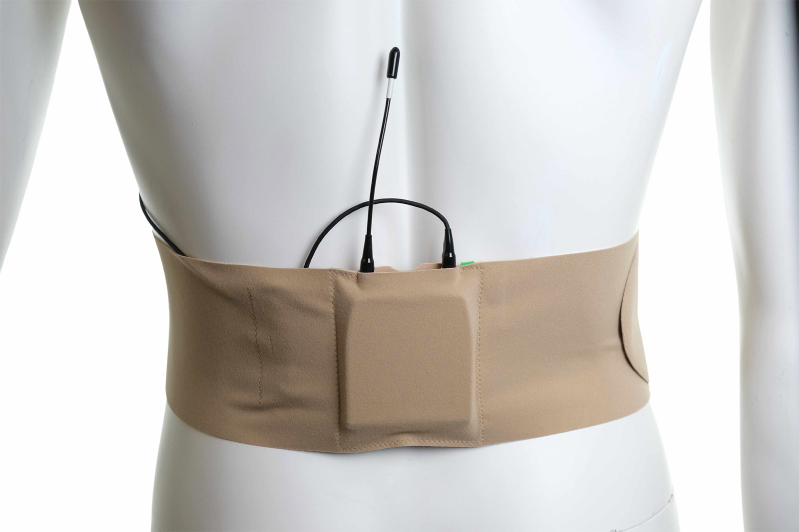 Ces ceintures "ultra-minces et respirantes" sont fabriquées à partir d'un tissu collé de 1 mm d'épaisseur qui permet de fixer la pince à crochet à n'importe quel endroit. Ainsi, l'utilisateur peut toujours positionner et attacher la ceinture à un niveau qui lui est confortable. Disponibles avec de petites ou grandes poches intégrées mesurant respectivement 8,9 x 7,8 cm ou 10 x 8 cm, les packs d'émetteurs sans fil de marques telles que Shure, Sennheiser et Sony sont compatibles (voir tableau ci-dessous). En plus de la poche qui contient l'émetteur ou le récepteur, une deuxième poche à extrémité ouverte permet de ranger le surplus de câble.
