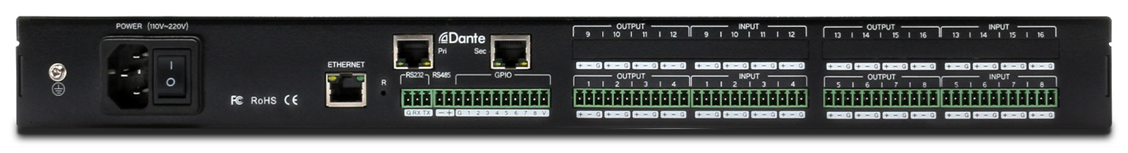 Le processeur comprend des fonctions telles que l'annulation de l'écho audio (AEC), le contrôle automatique de la fréquence (AFC), l'annulation automatique du bruit (ANC), la compression, la limitation, le mélangeur et l'égalisation graphique. Le produit est doté d'un logiciel de contrôle de version PC permettant de surveiller et d'utiliser toutes les fonctions du DSP. La connectivité entrée-sortie comprend 4x entrées sur bornes et 4x sorties symétriques par le biais d'une connexion à 3 pts, des connexions de contrôle RS485 et TCP/IP, ainsi que des ports Dante doubles. Les entrées analogiques supportent une alimentation fantôme de 48V.