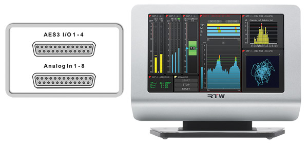 Le panneau frontal de l'unité de contrôle est doté d'un écran tactile de 4,3 pouces pour la surveillance et le contrôle des compteurs et des réglages, et un câble fixe pour la connexion au matériel d'interface est placé sur le bord inférieur du panneau arrière. Le matériel d'interface regroupe toutes les connectivités E/S, y compris une entrée/sortie analogique gauche/droite ou AES3 sur un connecteur Sub-D, un GPIO sur un connecteur RJ12, une connexion USB 2.0 mini-B pour les mises à jour, un connecteur secteur verrouillable à 4 points, et des E/S analogiques et SPDIF sur deux connecteurs RCA (phono). Remarque : RTW indique que la longueur des câbles analogiques/SPDIF terminés par des connecteurs RCA ne doit pas dépasser 3 m.