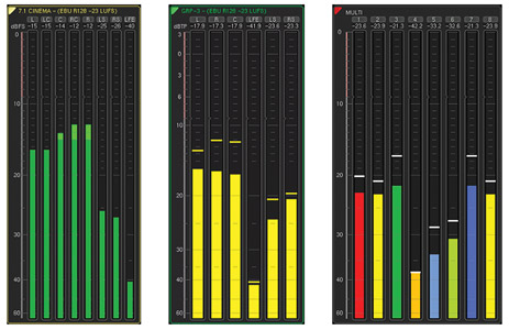 La licence MULTI-CHANNEl permet d'étendre le PPM de base et l'indicateur TruePeak jusqu'à 8 canaux dans un groupe traitant des signaux mono, stéréo, 3.1 surround, 5.0 surround, 5.1 surround, 7.1 surround (cinéma et DD+), et à plusieurs canaux pour 2 à 8 canaux dans un bloc, et jusqu'à 4 blocs avec l'AoIP ou le 3G SDI. Plusieurs canaux ou groupes de canaux peuvent être affichés simultanément. L'instrument de réduction de gain dispose également du mode multicanal. Comme dans le logiciel de base, les échelles analogiques et numériques, le maintien des crêtes, la mémoire des crêtes, l'indicateur de dépassement et l'affichage numérique sont disponibles. Les graphiques à barres de l'intensité sonore peuvent être changés avec la licence Loudness (SW20002).