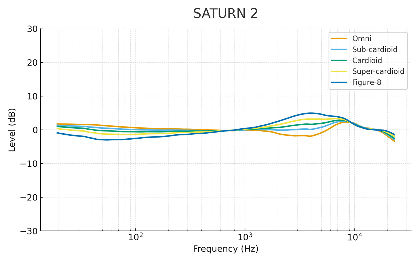 Saturn 2 features an innovative digitally encoded controller, that allows the user to select one of nine patterns shown on the front of the mic. These patterns include omni, subcardioid, cardioid, hypercardioid, figure-of-eight, and any of the four positions in between. This digital control ensures precise voltages being sent to the front and rear of the capsule, allowing for perfect matching between mics.