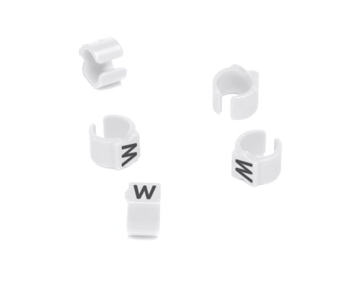 Les marqueurs sont disponibles avec des lettres imprimées en noir sur marqueur blanc et des chiffres 0-9, en couleur conforme au code couleur des résistances (RCC) ou en noir sur marqueur blanc (BW).