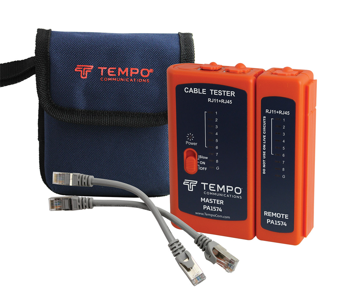 Gamme de testeurs de câbles de Tempo Communications permettant de vérifier la continuité et le câblage en quelques secondes. Les émetteurs et les récepteurs se verrouillent entre eux pour un rangement facile et sont fournis avec une pochette pour un transport aisé.