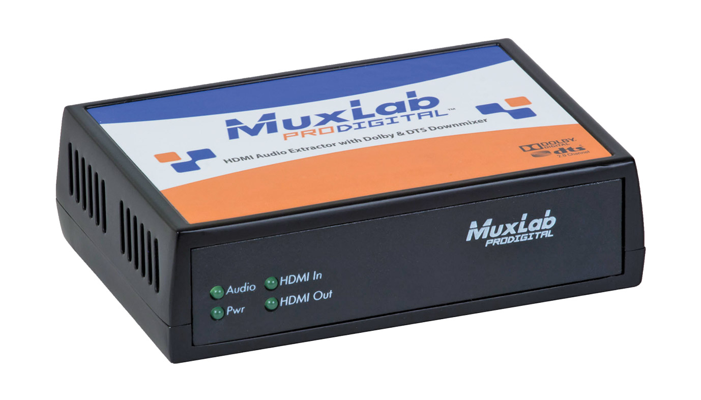 Conçu pour être utilisé dans la signalisation numérique, les services d'information médicale, les systèmes de projection en salle de classe et les systèmes audiovisuels commerciaux, le 500439 permet l'extraction audio d'une source vidéo tout en mettant en boucle, et donc en étendant, la source HDMI à un écran local prenant en charge HDMI jusqu'à 4K/60, et HDCP 1.4 et 2.2, cet extracteur audio mélange les signaux Dolby Digital, Dolby Digital Plus, Dolby TrueHD, DTS, DTS-HD, ou LPCM jusqu'à 7.1 canaux avec un son analogique à 2 canaux, et les restitue via une double connexion RCA (phono).