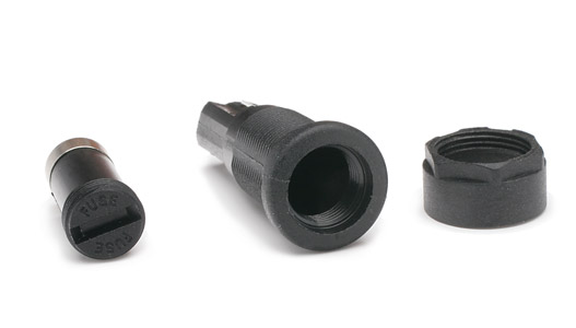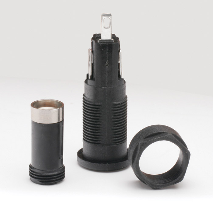 Porte-fusible pour panneau (trous 12,8 mm) à ergots, douille isolée (conforme BS3042, IEC257) actionnable par tournevis pour fusible de 20 mm. Fixation par écrou 6 pans sur panneau d'épaisseur max 6,4 mm. Profondeur arrière : 38 mm. Terminaux à poussoir 2,8 mm pouvant être soudés. 10 A, 250 V AC. Capots isolants moulés disponibles.