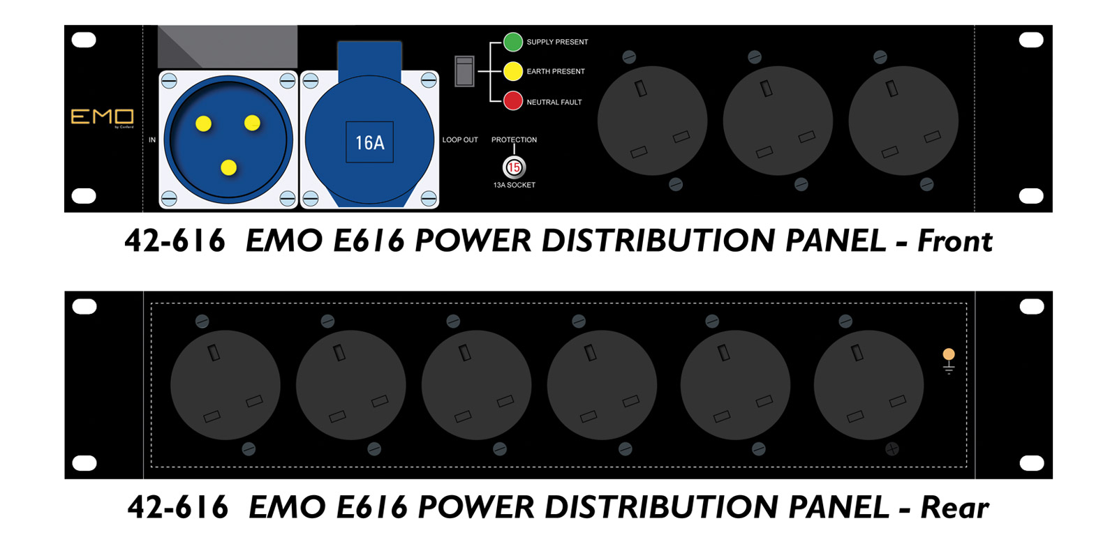 Tous les modèles sont équipés d'indicateurs LED "feux tricolores" indiquant l'état de présence de l'alimentation, de la présence de la terre et de la défaillance du neutre, qui peuvent être désactivés par un interrupteur à bascule pour une utilisation en faible lumière sur scène et afin de permettre un test PAT. Tous les connecteurs de sortie sont câblés via des disjoncteurs thermiques à maximum de courant. Les points de mise à la terre à l'arrière de tous les modèles sont équipés de série de points de masse. Boîtier arrière en acier de 100 mm de profondeur.