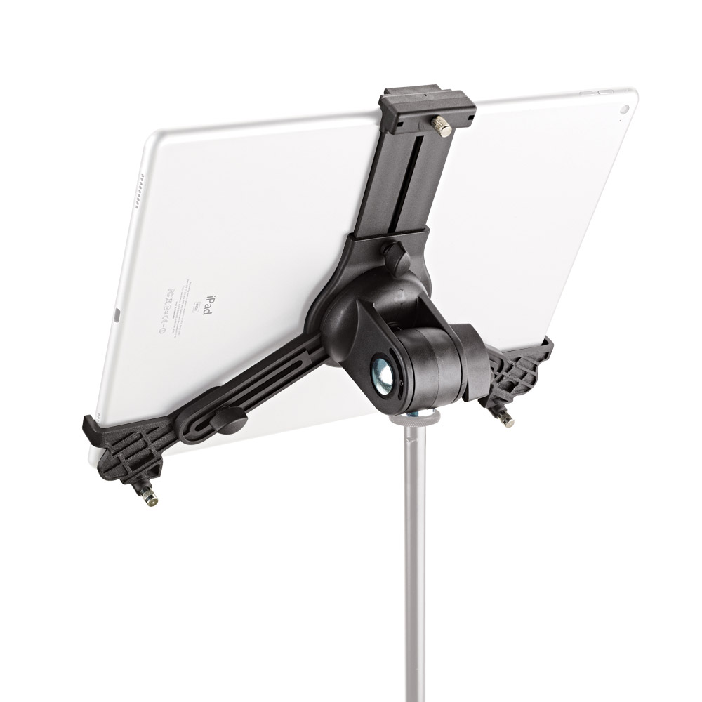 Ce modèle permet d'accueillir une variété de tablettes de différentes hauteurs, largeurs et profondeurs. Le support est compatible avec les appareils de 5 à 11 mm de profondeur ; 163mm à 242 mm de hauteur ; 102 à 189 mm de largeur, ce qui le rend compatible avec des appareils tels que l'iPad d'Apple, l'iPad 9.7, l'iPad Pro, l'Amazon Fire HDX 8.9, la Google Nexus 9 et d'autres appareils de dimensions similaires. Lors de la première utilisation, il peut être ajusté à la taille de l'appareil avant que les vis de serrage ne figent les positions. Un loquet permet une installation et une libération rapide de la tablette. Un écrou papillon situé à l'arrière du support permet de régler l'angle d'affichage de la tablette ; il est également possible de régler les positions portrait ou paysage. Un filetage standard 3/8" permet une fixation aux pieds de micro et aux accessoires. Poids : 0,36 kg.