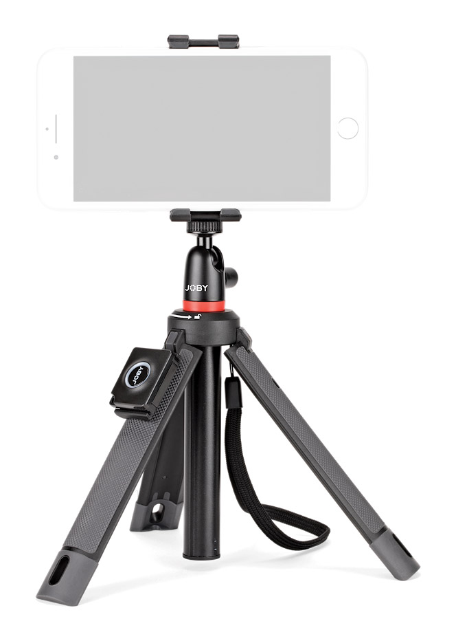 Comme le kit TelePod Pro, il comprend toutefois un support Pin Joint, une griffe froide universelle, un support Griptight PRO 2 et une dragonne. Sa capacité de poids est de 1 kg et sa longueur est de 63,5 cm. La télécommande Bluetooth fournie peut être fixée au trépied ou transportée séparément pour le déclenchement à distance. Les pieds du trépied peuvent être positionnés selon trois angles prédéfinis qui s'enclenchent lors du réglage. Dans sa position la plus large, le trépied a un diamètre de base de 36 cm. Fabriqué en plastique ABS, polyacrylamide, acier inoxydable, TPE et aluminium.