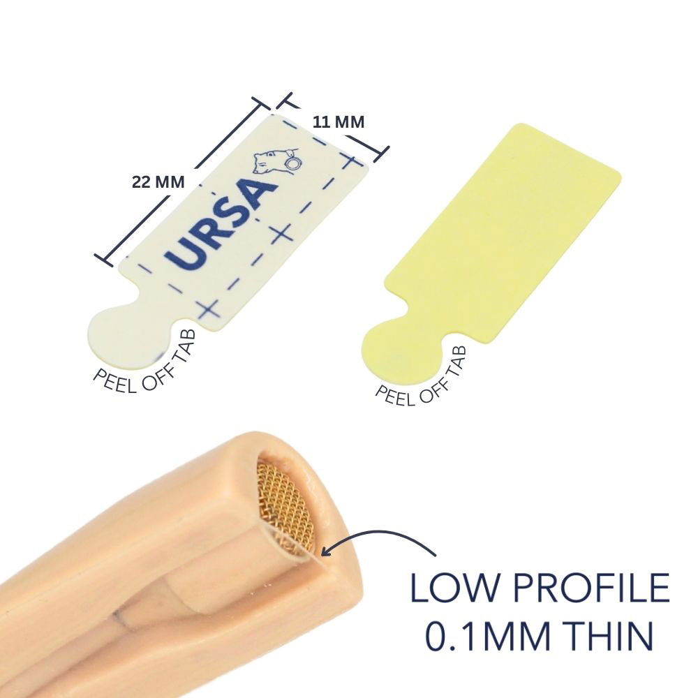 Les bandes URSA sont fabriquées à partir de la même formule adhésive que les cercles adhésifs, mais elles sont prédécoupées en bandes de 78 x 22 mm. Le support fendu, semblable à un pansement, permet une application facile. Les bandes sont hypoallergéniques et peuvent être utilisées en toute sécurité sur la plupart des types de peau. Elles ne laissent pas de résidus sur les costumes et les tissus délicats.
