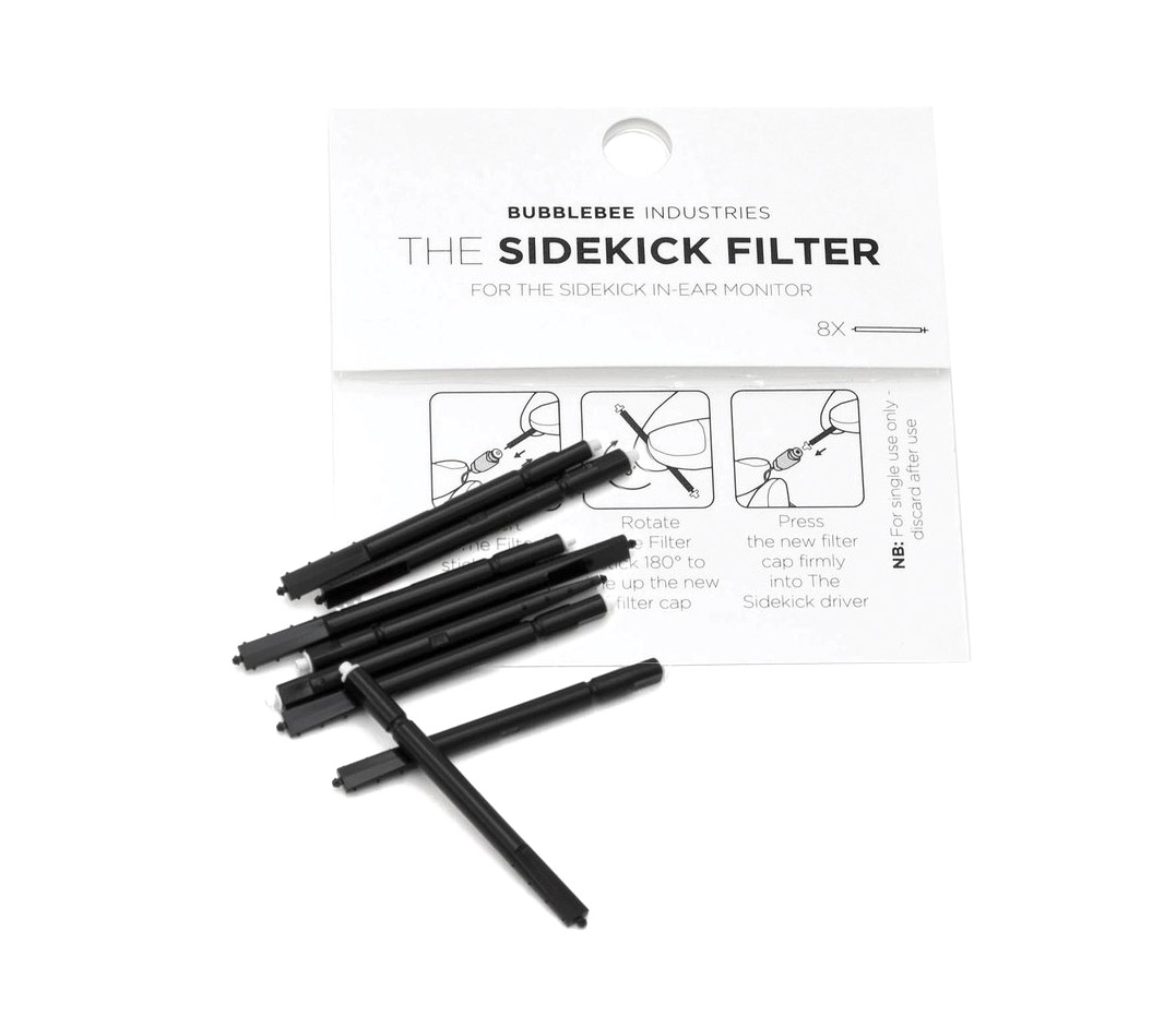 Un paquet de huit filtres avec l'outil d'insertion/retrait correspondant. Le filtre est conçu pour empêcher la poussière et la saleté de pénétrer dans le transducteur du Sidekick, ce qui lui donne une plus longue durée de vie. Bubble suggère que le pack de filtres, s'il est utilisé correctement dans des conditions normales, durera facilement toute la durée de vie de votre Sidekick.