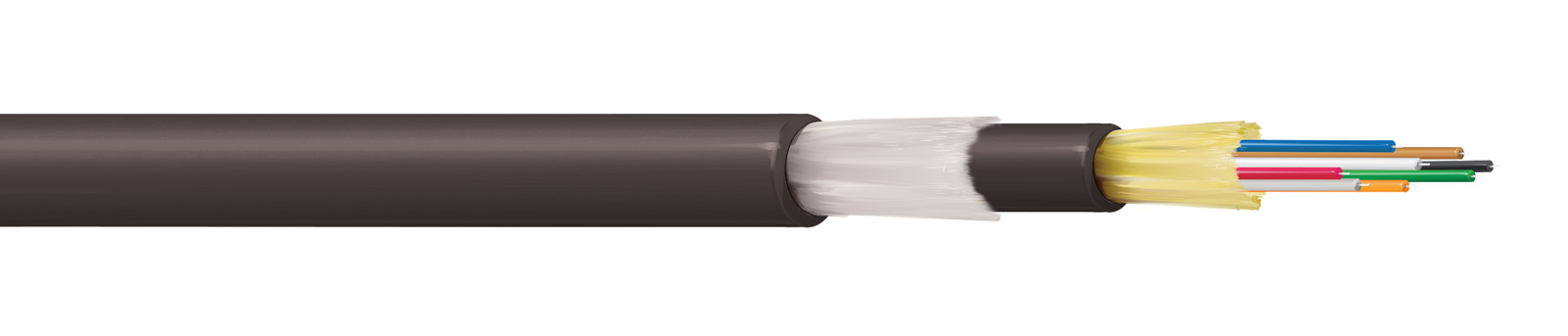 Construction dense et tamponnée présentant une excellente résistance aux chocs et à l'écrasement. Les gaines extérieure et intérieure en PUR offrent une flexibilité ainsi qu'une résistance à l'abrasion et aux produits chimiques, les fils de verre gonflables entre les deux gaines agissant comme des éléments de résistance supplémentaires. Sous la gaine intérieure est disposé un fil gonflable qui se dilate au contact de l'eau et étanche les petites coupures ou perforations. Ce câble rond compact est facilement enroulable et a une faible mémoire de forme. Disponible avec 2, 4, 6, 8, 12 ou 24 âmes. Ces versions multimodes ont une âme OM3 50/125 optimisée pour 850 nm et 1300 nm et conviennent à des débits de transmission allant jusqu'à 10 Gbit/s.