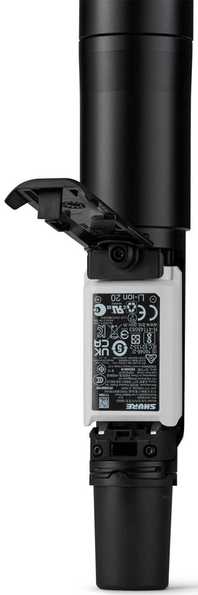 L'émetteur portatif SLXD2 est fabriqué en métal pour plus de durabilité et offre des capsules micro interchangeables, notamment SM58, BETA58a, KSM8, BETA87a entre autres. Cet émetteur portatif est capable d'émettre une plage de fréquences de 20 Hz à 20 kHz avec une réponse plate, néanmoins chaque capsule micro offre une courbe de réponse en fréquences différente. L'utilisation peut durer jusqu'à huit heures en continu avec deux piles alcalines AA, ou un seul bloc de piles au lithium SB903 peut être utilisé pour obtenir des informations de surveillance, notamment sur l'état de la pile, son état et sa charge restante en quelques heures et minutes. Des contacts de charge externes à la base du microphone permettent de recharger les piles SB903 lorsqu'elles sont utilisées avec l'unité de charge Shure SBC203 compatible. Comme le SLXD1, le SLXD2 offre un écran OLED qui affiche des informations importantes, notamment le groupe/canal et la fréquence. Les fonctions de verrouillage sont accessibles en naviguant dans le menu utilisateur.