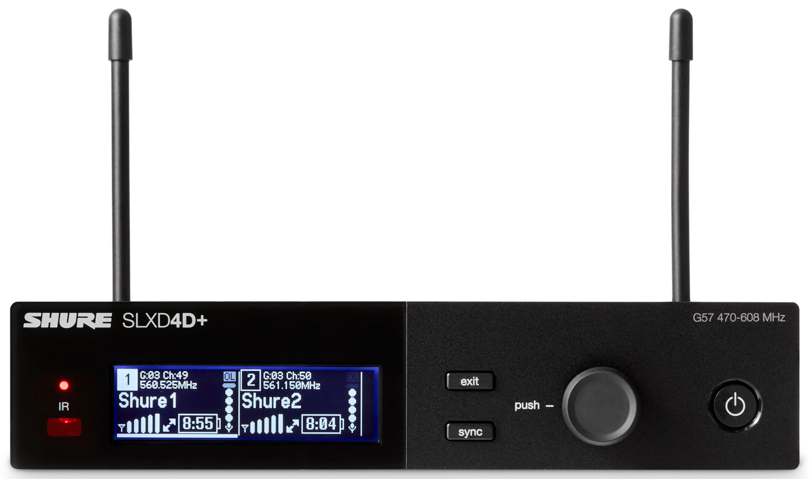 SLXD4Q+ possède toutes les fonctionnalités et spécifications du SLXD4, mais il est quatruplé en termes de nombre de chaînes. Le récepteur fonctionne sur une bande large de 138 MHz, ou 44 MHz lorsqu'il est utilisé avec des émetteurs à bande étroite.