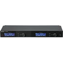 Le panneau arrière du récepteur regroupe toutes les connexions audio et de données, y compris les connecteurs BNC pour les antennes A et B, l'entrée d'alimentation en courant continu, le port Ethernet avec LED associée pour l'état, et les sorties audio sur XLR3 symétrique et jack 6,35 mm symétrique. La fixation de montage en rack est prévue pour un montage en rack 19 pouces.