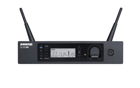 Partie intégrante de tous les systèmes GLXD, le récepteur GLXD4R a une antenne amovible à l'arrière et peut être installé en rack à l'aide des accessoires de montage fournis. Jusqu'à 4 récepteurs ou 6 en utilisant le gestionnaire de fréquences UA846Z2/LC, peuvent fonctionner en simultané. Ils peuvent fonctionner à 8 avec l'utilisation de deux unités UA846Z2/LC. Un port pour recharge de batterie sur le panneau avant peut recharger, s'il est allumé, une batterie Li-Ion Shure SB902. Une LED à deux couleurs indique l'état de charge, vert indiquant la charge complète, vert clignotant une charge à 90% et rouge que la charge est en court.