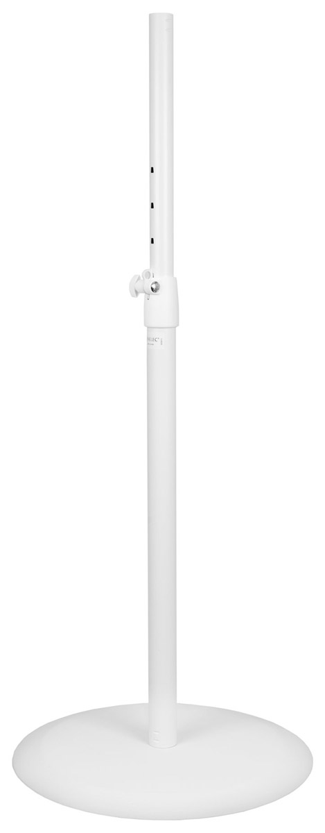 Pied de sol avec base en fonte de 450 mm de diamètre et anneau anti-vibration. Disponible en noir et en blanc. Le support est réglable en hauteur de 950 à 1430 mm, a une capacité de charge de 35 kg et est compatible avec les moniteurs Genelec des modèles 8010 et 8351. Poids : 10,6 kg.