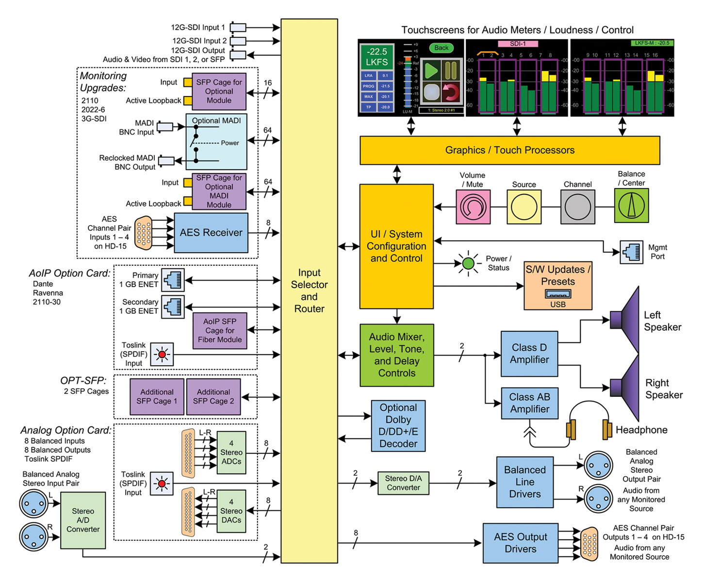 L'utilisateur peut acquérir des licences pour des formats de signaux et des options de traitement supplémentaires, notamment Dolby, AoIP, Toslink et analogique à 8 canaux, en fonction de ses besoins, ce qui garantit l'évolutivité du produit. Options pour signaux supplémentaires, y compris AES3, MADI64, DanteTM, RavennaTM, SMPTE-2110 et SMPTE-2022-7.