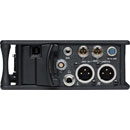 Le côté gauche de l'unité présente trois connecteurs d'entrée XLR symétriques actifs, l'entrée pouvant également être utilisée pour les signaux d'entrée AES3 ou AES42, quatre entrées micro/ligne TA3 symétriques actives, une prise casque jack TRS 3,5 mm asymétrique, un retour Com sur TA3 et une connexion TA5 pour casque/micro/Slate externe.