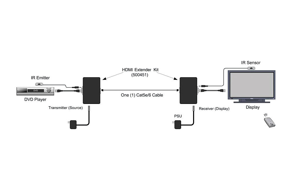Il dispose des mêmes fonctionnalités que le 500450, mais cette version longue portée (appelée "LR") est capable d'atteindre des distances de 150 m avec un câble STP ou UTP Cat5e/6. La résolution maximale compatible est de 1080p. Ce kit comprend également l'émetteur IR 500998 et le capteur IR 500999.