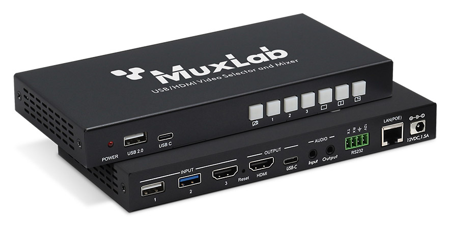 Conçu pour les salles de conférence ou les centres de conférence, les hôtels et le secteur de l'éducation, le Muxlab 500882 est un sélecteur et mélangeur vidéo USB et/ou HDMI qui permet de basculer entre trois sources, à savoir 1 port USB 3.0, 1 port USB 2.0 et 1 port HDMI. Deux des signaux peuvent ensuite être mixés en une seule image, fournissant une sortie HDMI unique pour la visualisation locale, et une sortie USB-C unique pour permettre à l'ordinateur d'effectuer des conférences web ou des diffusions en direct. L'appareil peut être géré localement à l'aide des boutons du panneau avant, en RS232 et sur un réseau Ethernet, et comprend une alimentation 12 VCC. Prend également en charge le PoE.