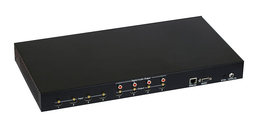 La 500444 est en boîtier métallique pouvant être posé sur une surface ou installé en rack 1U avec les fixations incluses. Les touches de contrôle et l'écran LCD du panneau avant permettent de contrôler tout changement de réglages ainsi que le mode EDID. Le panneau arrière présente 4x entrées HDMI, 4x sorties HDMI, 4x sorties RCA coaxiales audio numériques, une RJ45 pour un contrôle à distance vis Ethernet, une prise jack pour le récepteur IR et un connecteur DB9 pour le contrôle RS232.
