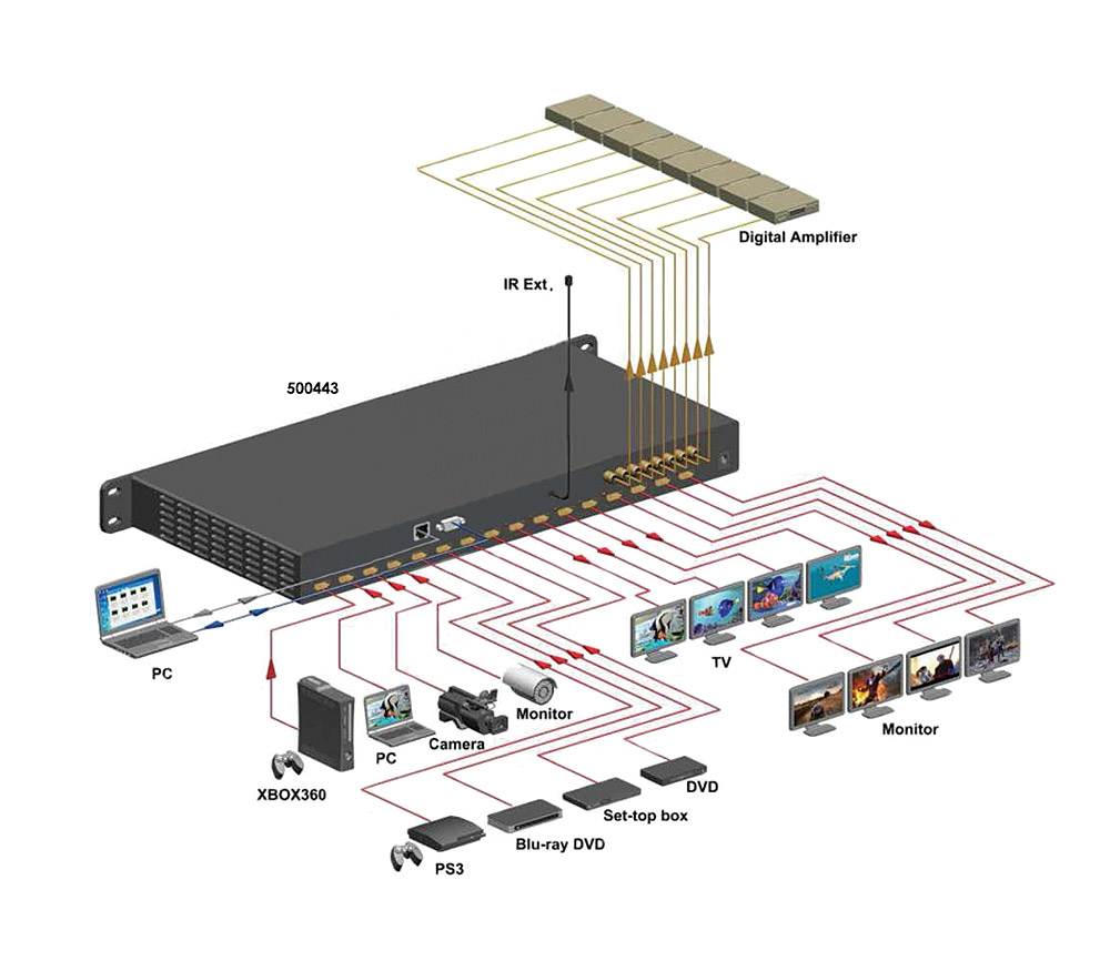 La 500444 est en boîtier métallique pouvant être posé sur une surface ou installé en rack 1U avec les fixations incluses. Les touches de contrôle et l'écran LCD du panneau avant permettent de contrôler tout changement de réglages ainsi que le mode EDID. Le panneau arrière présente 4x entrées HDMI, 4x sorties HDMI, 4x sorties RCA coaxiales audio numériques, une RJ45 pour un contrôle à distance vis Ethernet, une prise jack pour le récepteur IR et un connecteur DB9 pour le contrôle RS232.