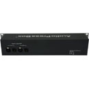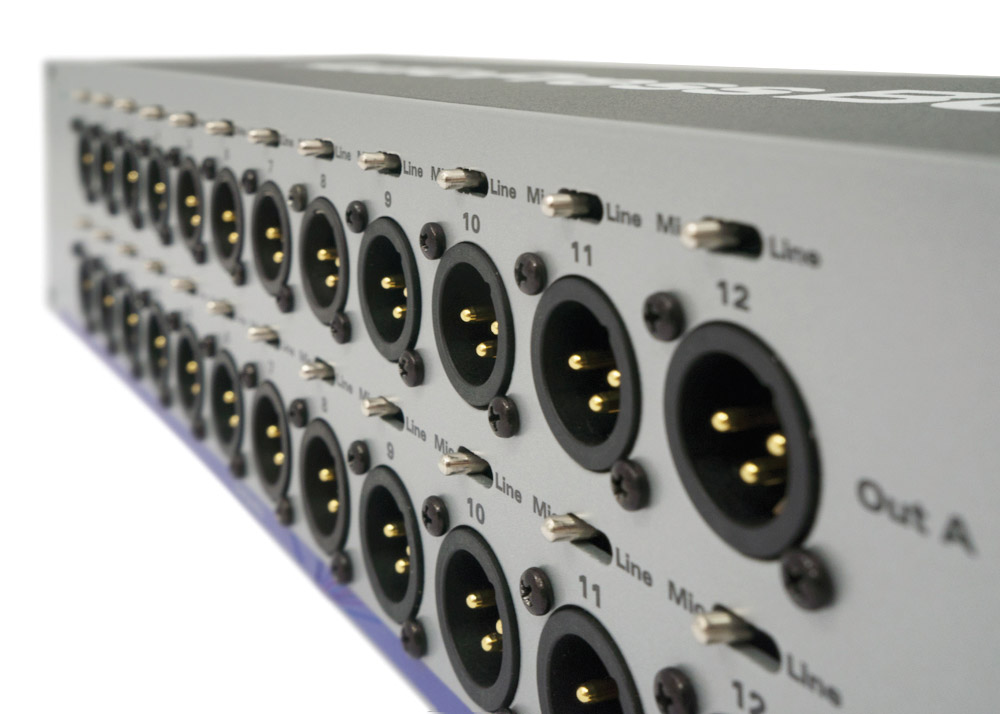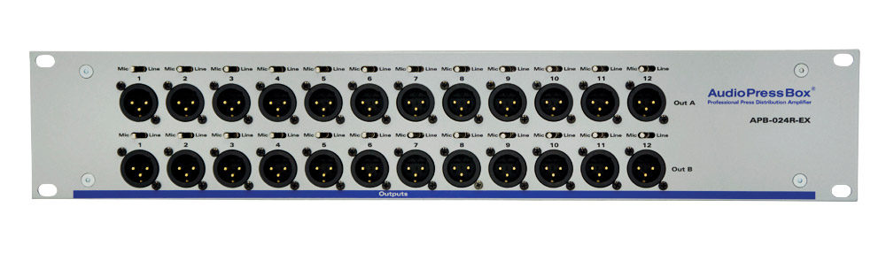 Le APB-024 R-EX est logé dans un boîtier pour installation en rack 2U avec sorties XLR individuelles et commutateurs micro/ligne à l'avant. L'arrière propose deux paires de connecteurs XLR fournissant une entrée et des sorties boucle pour les entrées A et B.